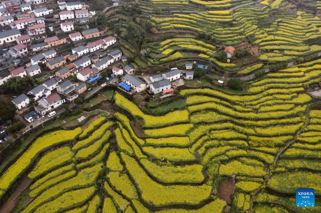 This aerial photo taken on March 25, 2023 shows tourists enjoying themselves in a canola flower field at an eco-tourism scenic spot in Balidian Town of Huzhou City, east China's Zhejiang Province. In June 2003, Zhejiang Province launched the "Thousand Villages Demonstration and Ten Thousand Villages Renovation" project, with the aim of comprehensively renovating ten thousand administrative villages in the province and building a thousand key villages of them into all-round well-off model villages. For twenty years, the project has created thousands of beautiful villages, and fundamentally changed the face of the province's countryside. (Xinhua/Huang Zongzhi)