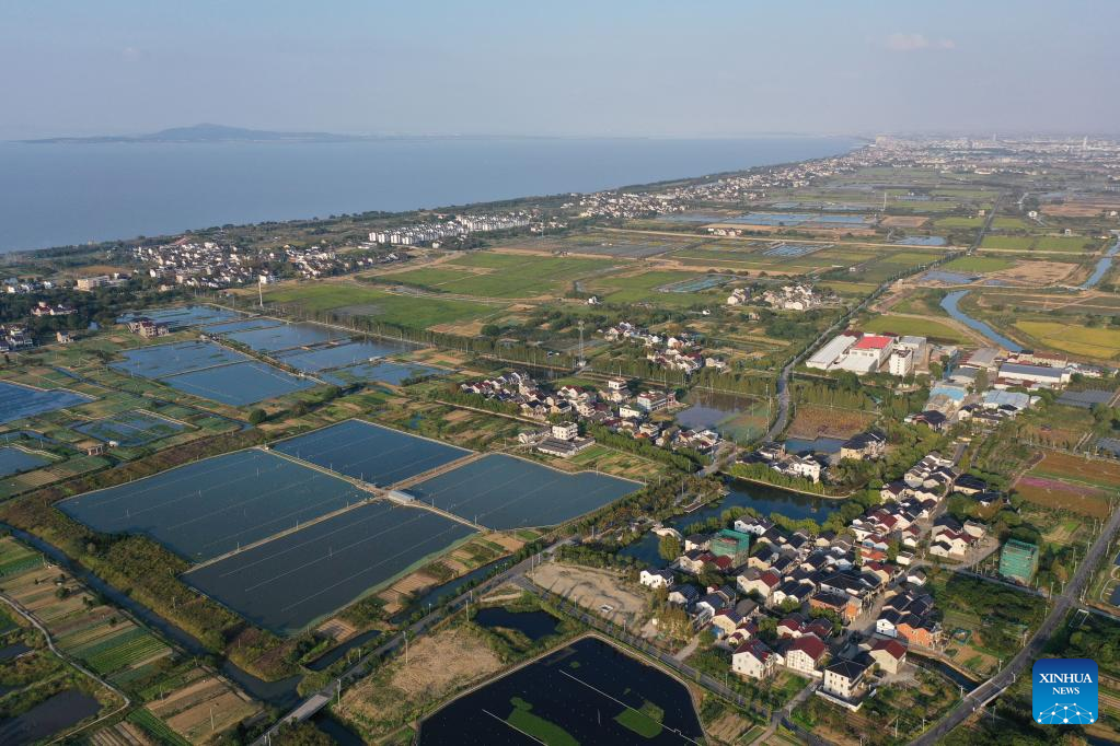 This aerial photo taken on Oct. 13, 2022 shows a view of a village adjacent to the Taihu Lake in Wuxing District of Huzhou City, east China's Zhejiang Province. In June 2003, Zhejiang Province launched the "Thousand Villages Demonstration and Ten Thousand Villages Renovation" project, with the aim of comprehensively renovating ten thousand administrative villages in the province and building a thousand key villages of them into all-round well-off model villages. For twenty years, the project has created thousands of beautiful villages, and fundamentally changed the face of the province's countryside. (Xinhua/Huang Zongzhi)