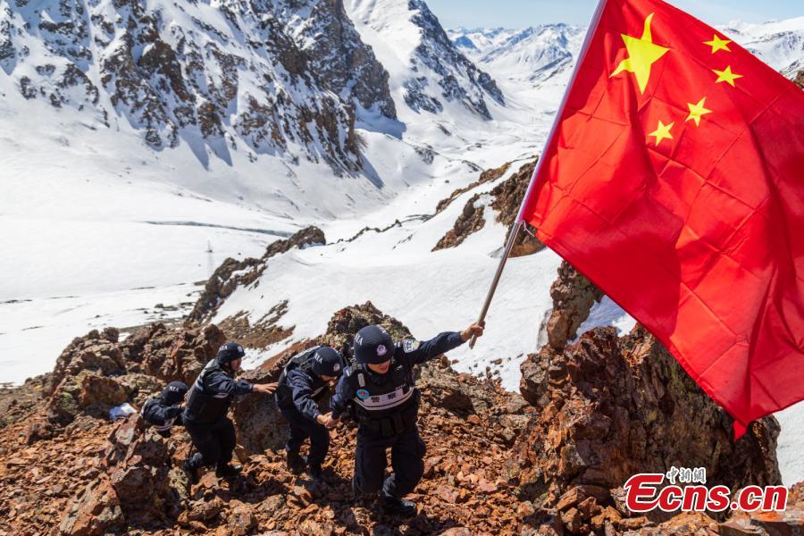 Police officers walk hand-in-hand on a snow-covered mountain to patrol the border area more than 3,600 above sea level in northwest China's Xinjiang Uygur Autonomous Region, April 9, 2023. (Photo: China News Service/Lv Zhiheng)