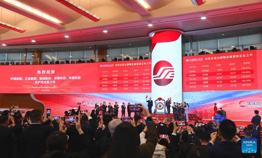 This photo taken on April 10, 2023 shows the ceremony celebrating the listing of the first batch of shares under China's registration-based initial public offering (IPO) system on the main board of Shanghai Stock Exchange in east China's Shanghai. The first batch of 10 shares under China's registration-based IPO system started trading Monday on the main boards of the Shanghai and Shenzhen stock exchanges. (Xinhua/Fang Zhe)