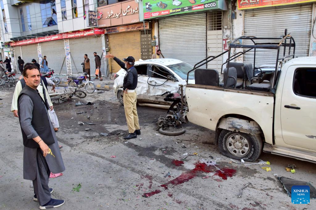 This photo taken on April 10, 2023 shows the blast site in Quetta, the provincial capital of Pakistan's southwest Balochistan province. At least four people, including two policemen, were killed and 15 others injured in a blast on Monday in Quetta, police and health officials said. (Str/Xinhua)