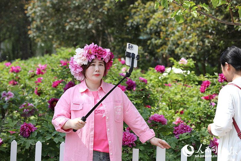 A tourist takes selfies with blooming peony flowers at the Caozhou Peony Garden in Mudan district, Heze city, east China’s Shandong Province. (People’s Daily Online/Liu Qi)