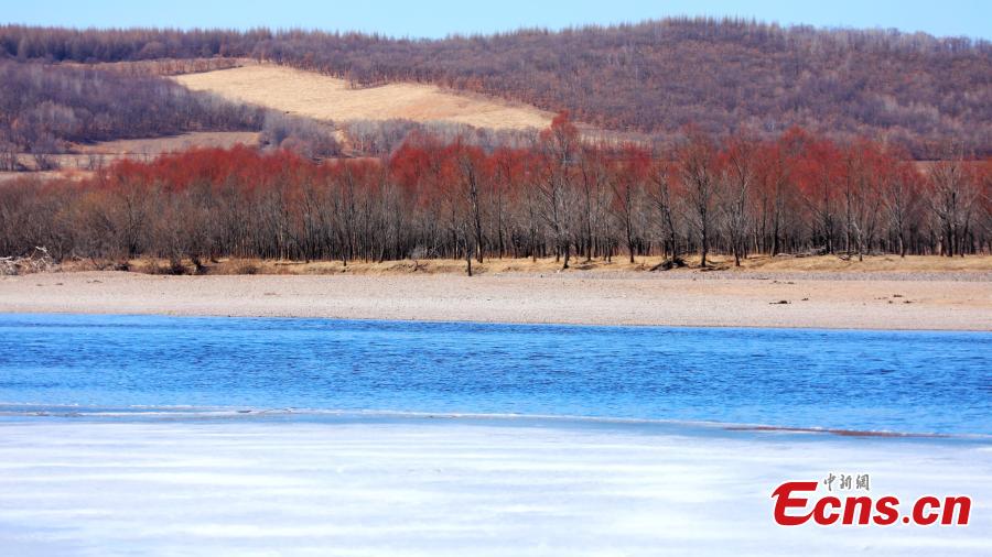 Red willows flourish on the banks of the Nuomin River with the arrival of spring in north China’s Inner Mongolia Autonomous Region. The red willows and the half-frozen river present a beautiful scene in April. (Photo: China News Service/Jiang Xiwu)
