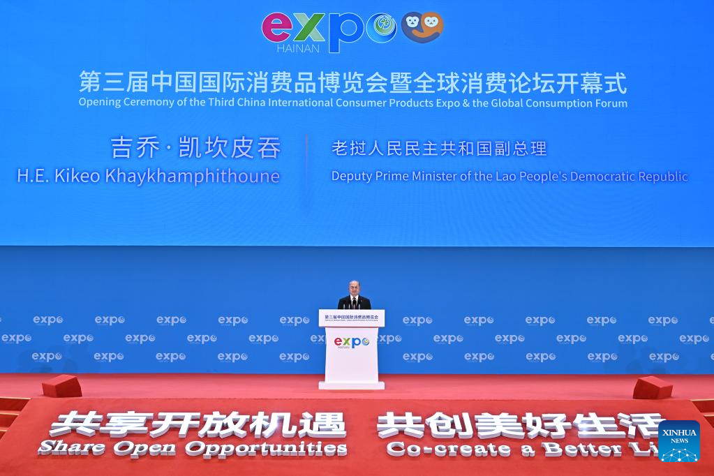 Lao Deputy Prime Minister Kikeo Khaykhamphithoune addresses the opening ceremony of the third China International Consumer Products Expo (CICPE) in Haikou, capital city of south China's Hainan Province, April 10, 2023. More than 3,300 high-quality brands from home and abroad have gathered at the third CICPE, which kicked off Monday in Haikou. (Xinhua/Li Xin)