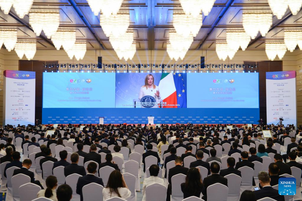 Italian Prime Minister Giorgia Meloni makes a video speech at the opening ceremony of the third China International Consumer Products Expo (CICPE) in Haikou, capital city of south China's Hainan Province, April 10, 2023. More than 3,300 high-quality brands from home and abroad have gathered at the third CICPE, which kicked off Monday in Haikou. (Xinhua/Wang Zecong)