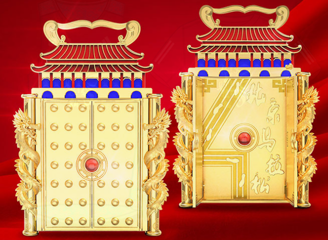 The finisher's medal for the 2022 Beike Beijing Marathon held in Beijing on Nov. 6, 2022 features the Tian'anmen Rostrum, the landmark at the starting point of the marathon. One of the design’s highlights are the doors - both they and the gateway can be opened and closed manually. Opening the doors reveals the calligraphic work "Beijing Marathon" . The two lifelike dragons twined around columns on either side of the gate make the design even more imposing.