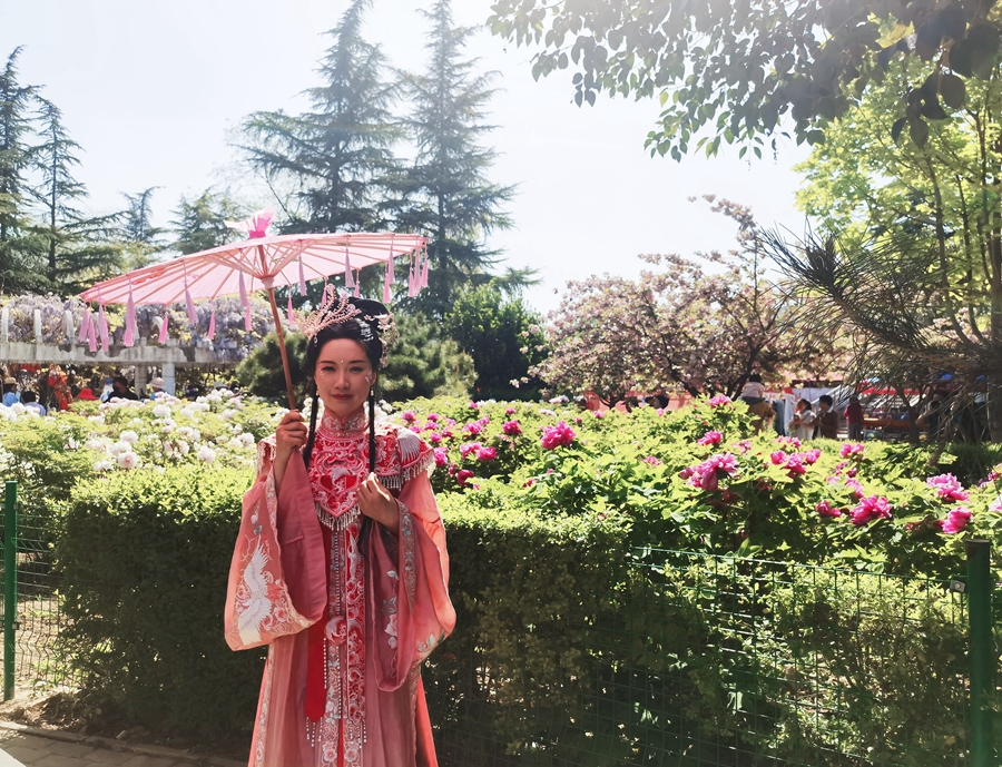 A tourist poses for a photo at the National Peony Garden in Luoyang, central China's Henan Province, April 10, 2023. (People’s Daily Online/Du Mingming)