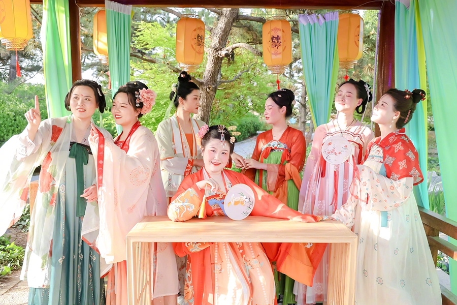 Photo shows a Hanfu show at the Jiuzhou Pond Scenic Area in Luoyang city, central China's Henan Province. (Photo courtesy of Jiuzhou Pond Scenic Area)
