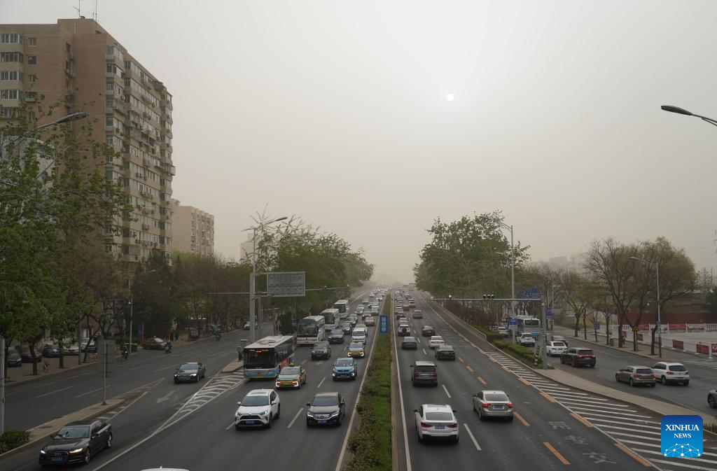 This photo taken on April 11, 2023 shows roads and buildings shrouded in dust in Haidian District of Beijing, capital of China. Floating sand and dust affected Beijing on Tuesday. (Xinhua/Ren Chao)