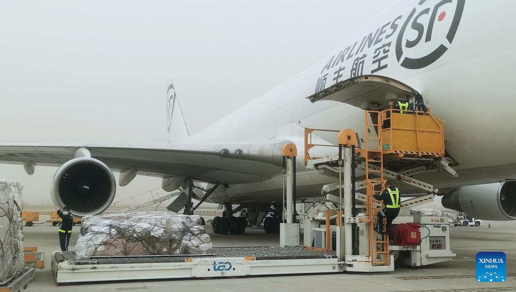 A freighter of SF Airlines is loaded at the Qingdao Jiaodong International Airport in Qingdao, east China's Shandong Province, April 11, 2023. An air cargo route linking east China's Qingdao and Belgium's Liege was launched on Tuesday, adding a new air logistics channel between China and Europe, according to SF Airlines. (SF Airlines/Handout via Xinhua)