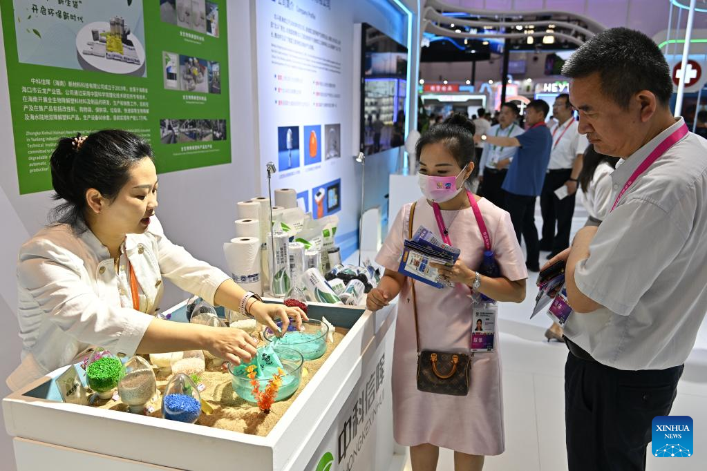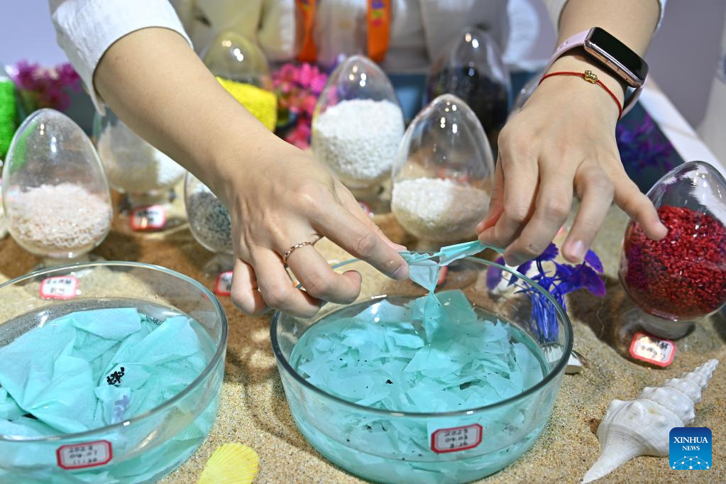 A staff member introduces a kind of rapidly degradable material at the third China International Consumer Products Expo (CICPE) in Haikou, capital city of south China's Hainan Province, April 11, 2023. Green and low-carbon production and consumption concepts can be found in many exhibition areas of the third CICPE. (Xinhua/Li Xin)