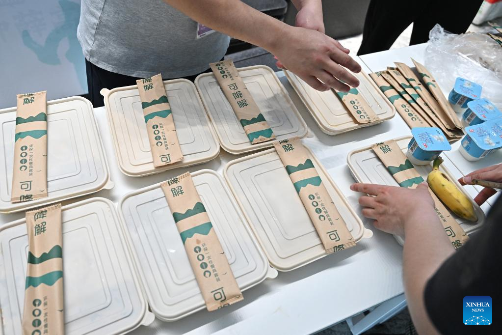 Degradable lunch boxes are used at the third China International Consumer Products Expo (CICPE) in Haikou, capital city of south China's Hainan Province, April 11, 2023. Green and low-carbon production and consumption concepts can be found in many exhibition areas of the third CICPE. (Xinhua/Li Xin)