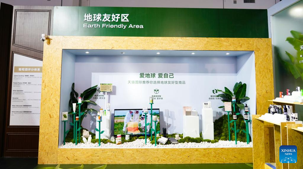 This photo taken on April 11, 2023 shows an Earth Friendly Area displaying products with recycled packages at the third China International Consumer Products Expo (CICPE) in Haikou, capital city of south China's Hainan Province. Green and low-carbon production and consumption concepts can be found in many exhibition areas of the third CICPE. (Xinhua/Fan Yuqing)