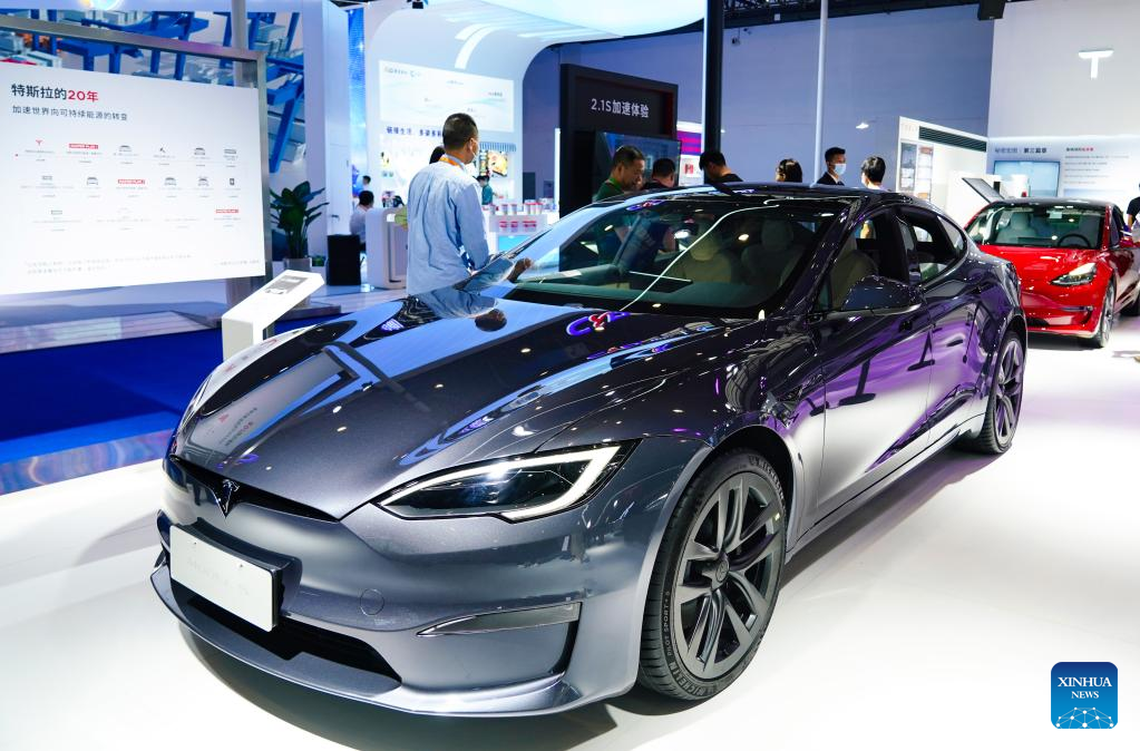 A Tesla car is displayed at the third China International Consumer Products Expo (CICPE) in Haikou, capital city of south China's Hainan Province, April 11, 2023. Green and low-carbon production and consumption concepts can be found in many exhibition areas of the third CICPE. (Xinhua/Fan Yuqing)