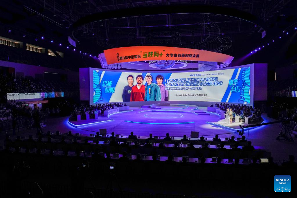 CHONGQING, April 11 (Xinhua) -- During the final of the eighth China International College Students' "Internet+" Innovation and Entrepreneurship Competition in southwest China's Chongqing Municipality, six top-notch teams presented their research results in various cutting-edge fields, including Artificial Intelligence, digital twin and computational imaging.