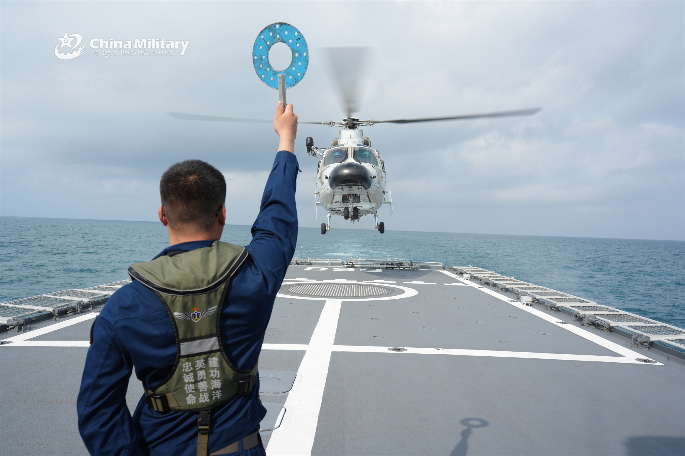 A ship-borne helicopter attached to a frigate flotilla with the navy under the PLA Southern Theater Command lands on the helipad during a recent maritime training exercise. (eng.chinamil.com.cn/Photo by Zhang Weifeng)