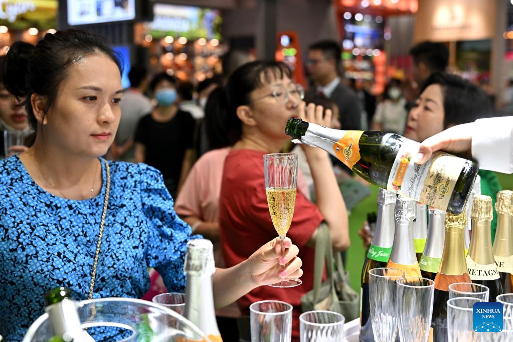 Visitors taste beverages at the third China International Consumer Products Expo (CICPE) in Haikou, capital city of south China's Hainan Province, April 12, 2023. Various food and beverage products from around the world are showcased during the expo held from April 10 to 15. (Xinhua/Li Xin)