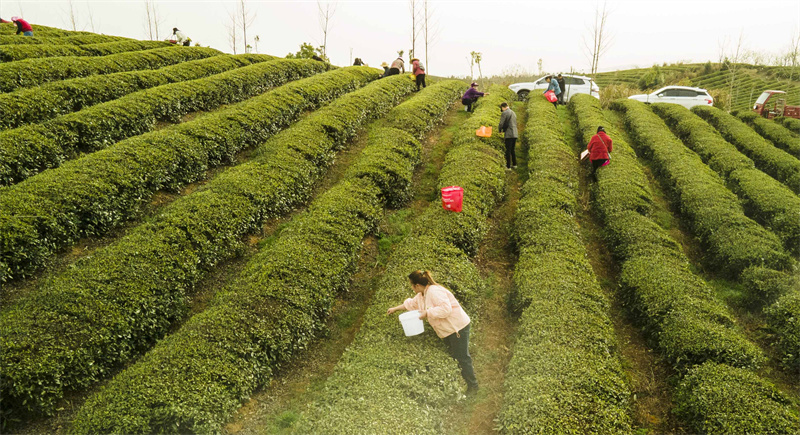 Farmers harvest tea leaves in Chibi city, central China’s Hubei Province. (Photo/Liu Jianguo)