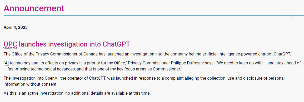 Canada is now the second country after Italy to launch an investigation into ChatGPT. On March 31, the Italian Data Protection Authority announced a ban that blocks OpenAI from processing the data of Italian users, and opened an investigation into the organization.