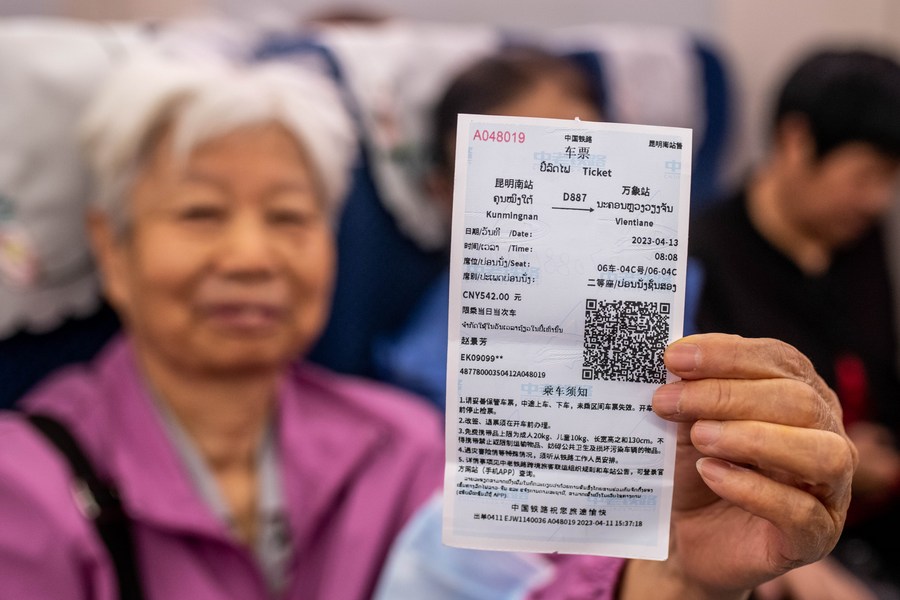 A passenger shows her ticket aboard the first cross-border passenger train from Kunming, southwest China's Yunnan Province to the Lao capital Vientiane on April 13, 2023. (Xinhua/Hu Chao)