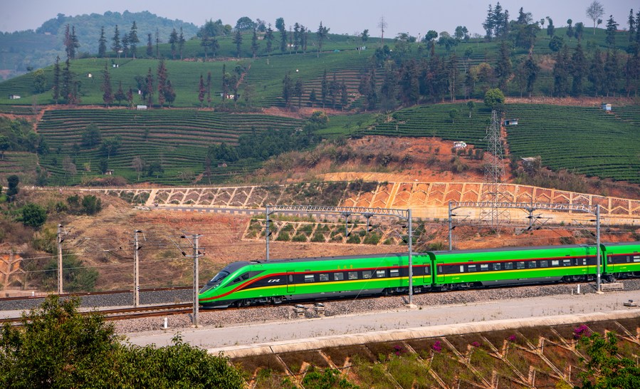 The first cross-border passenger train from Kunming, southwest China's Yunnan Province to the Lao capital Vientiane passes by tea plantations in Pu'er, southwest China's Yunnan Province, April 13, 2023. (Xinhua/Jiang Wenyao)
