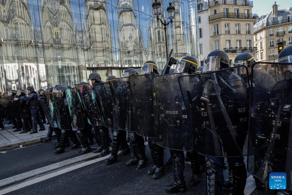 French gendarmes and CRS riot police stand guard during a demonstration against a pensions reform plan in Paris, France, on April 13, 2023. Around 380,000 people participated in the 12th nationwide general mobilization organized by the unions against the government's pension reform plan, the French Interior Ministry said on Thursday. (Photo by Aurelien Morissard/Xinhua)