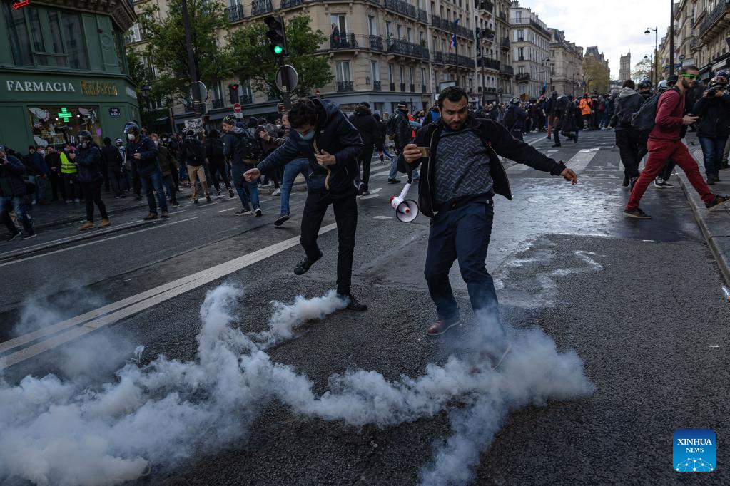 Protesters try to kick back tear gas canisters during a demonstration against a pensions reform plan in Paris, France, on April 13, 2023. Around 380,000 people participated in the 12th nationwide general mobilization organized by the unions against the government's pension reform plan, the French Interior Ministry said on Thursday. (Photo by Aurelien Morissard/Xinhua)
