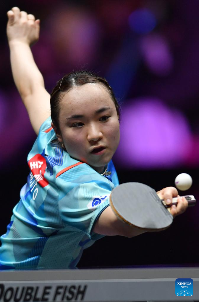 Ito Mima of Japan serves during the women's singles quarterfinal against Sun Yingsha of China at the WTT Champions Xinxiang 2023 in Xinxiang, central China's Henan Province, April 13, 2023. (Xinhua/Li Jianan)