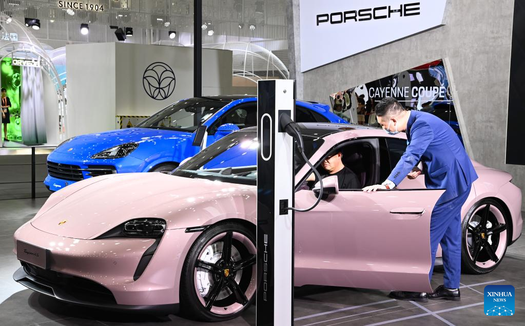 A visitor (L) tries a Porsche car at the third China International Consumer Products Expo (CICPE) in Haikou, south China's Hainan Province, April 13, 2023. The ongoing third CICPE held in China's southern province of Hainan has seen active participation from German enterprises with expertise in important consumer sectors including automobile, wristwatches, food and kitchenware. (Xinhua/Yang Guanyu)