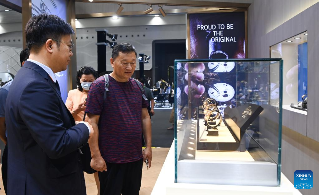 Visitors take a look at wristwatches by German watchmaker Glashtte Original at the third China International Consumer Products Expo (CICPE) in Haikou, south China's Hainan Province, April 13, 2023. The ongoing third CICPE held in China's southern province of Hainan has seen active participation from German enterprises with expertise in important consumer sectors including automobile, wristwatches, food and kitchenware. (Xinhua/Yang Guanyu)