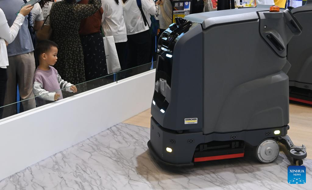 Visitors look at the intelligent cleaning robot KIRA B65 Classic by German enterprise Krcher at the third China International Consumer Products Expo (CICPE) in Haikou, south China's Hainan Province, April 13, 2023. The ongoing third CICPE held in China's southern province of Hainan has seen active participation from German enterprises with expertise in important consumer sectors including automobile, wristwatches, food and kitchenware. (Xinhua/Yang Guanyu)
