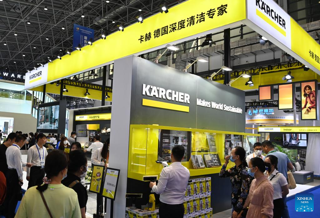This photo taken on April 13, 2023 shows the booth of German enterprise Krcher at the third China International Consumer Products Expo (CICPE) in Haikou, south China's Hainan Province. The ongoing third CICPE held in China's southern province of Hainan has seen active participation from German enterprises with expertise in important consumer sectors including automobile, wristwatches, food and kitchenware. (Xinhua/Yang Guanyu)