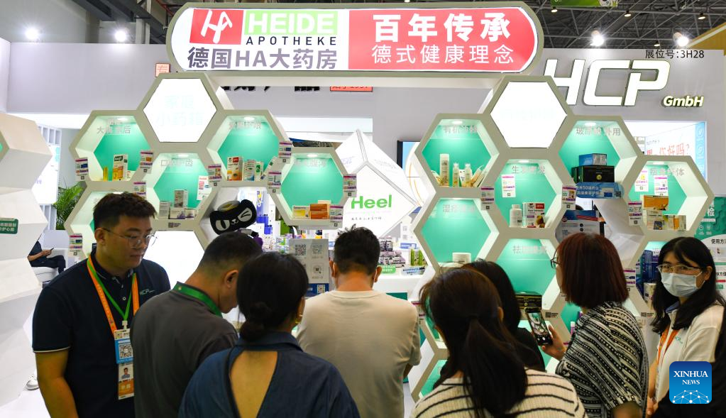 This photo taken on April 13, 2023 shows the booth of Heide Apotheke from Germany at the third China International Consumer Products Expo (CICPE) in Haikou, south China's Hainan Province. The ongoing third CICPE held in China's southern province of Hainan has seen active participation from German enterprises with expertise in important consumer sectors including automobile, wristwatches, food and kitchenware. (Xinhua/Yang Guanyu)