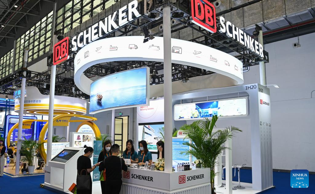 This photo taken on April 13, 2023 shows the booth of DB Schenker from Germany at the third China International Consumer Products Expo (CICPE) in Haikou, south China's Hainan Province. The ongoing third CICPE held in China's southern province of Hainan has seen active participation from German enterprises with expertise in important consumer sectors including automobile, wristwatches, food and kitchenware. (Xinhua/Yang Guanyu)