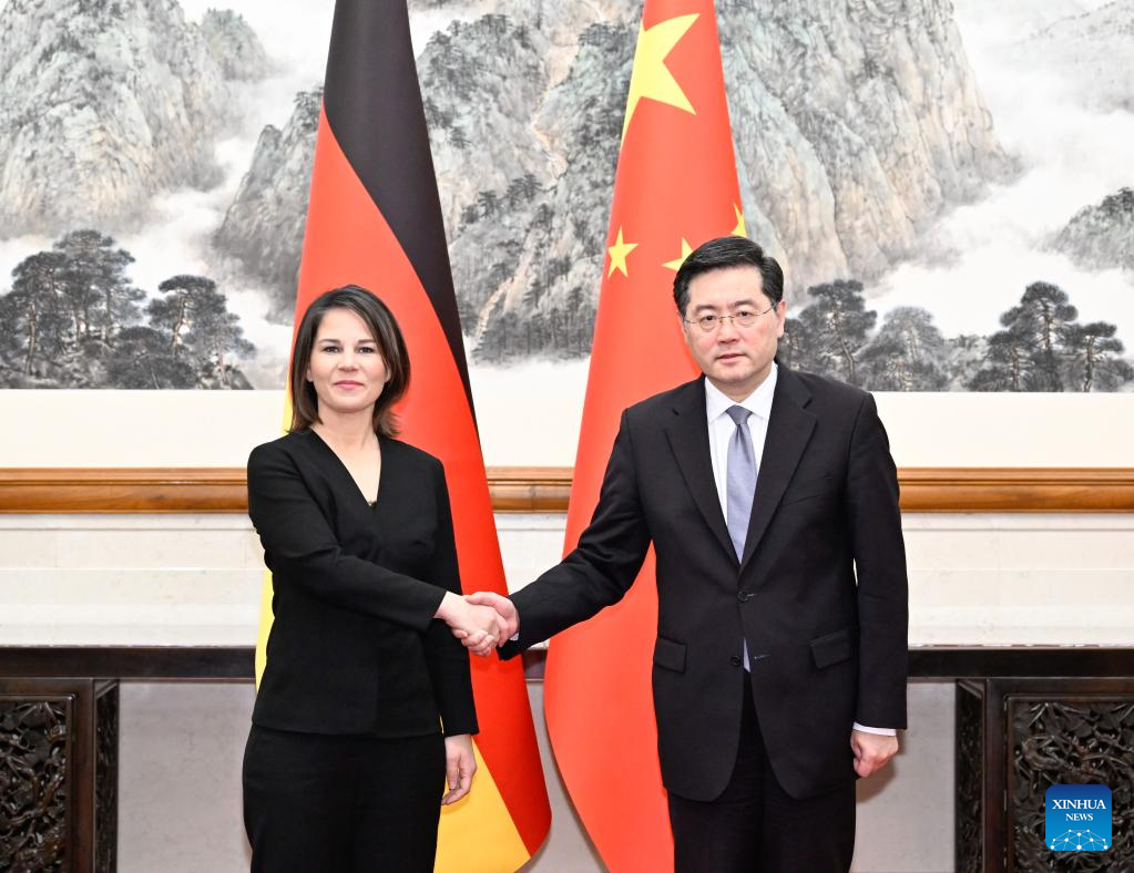 BEIJING, April 14 (Xinhua) -- Chinese State Councilor and Foreign Minister Qin Gang and visiting German Foreign Minister Annalena Baerbock co-chaired the sixth round of China-Germany strategic dialogue on diplomacy and security in Beijing on Friday.