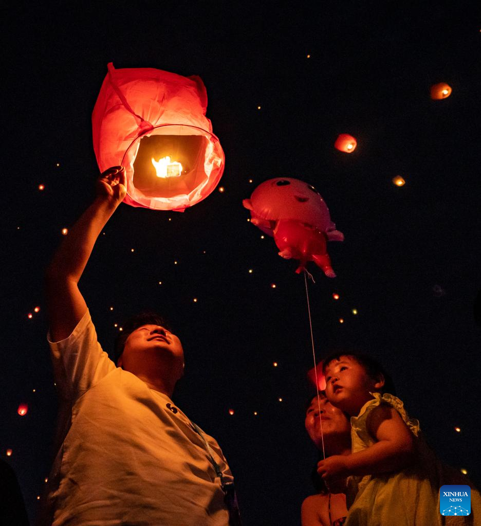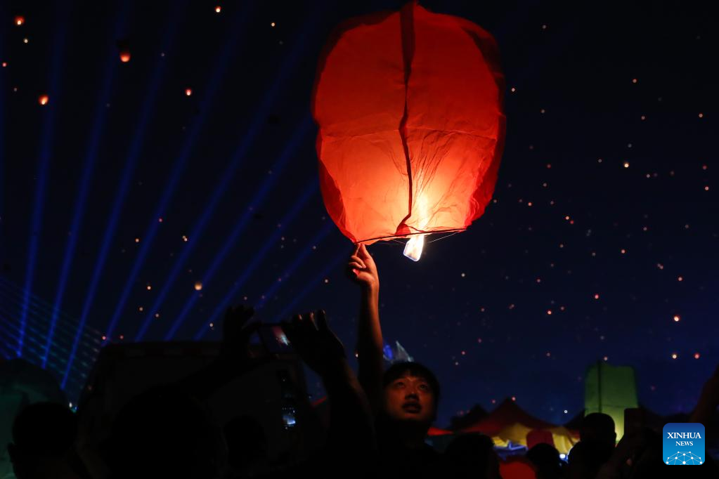 Sky lanterns released during annual Water Splashing Festival in SW China