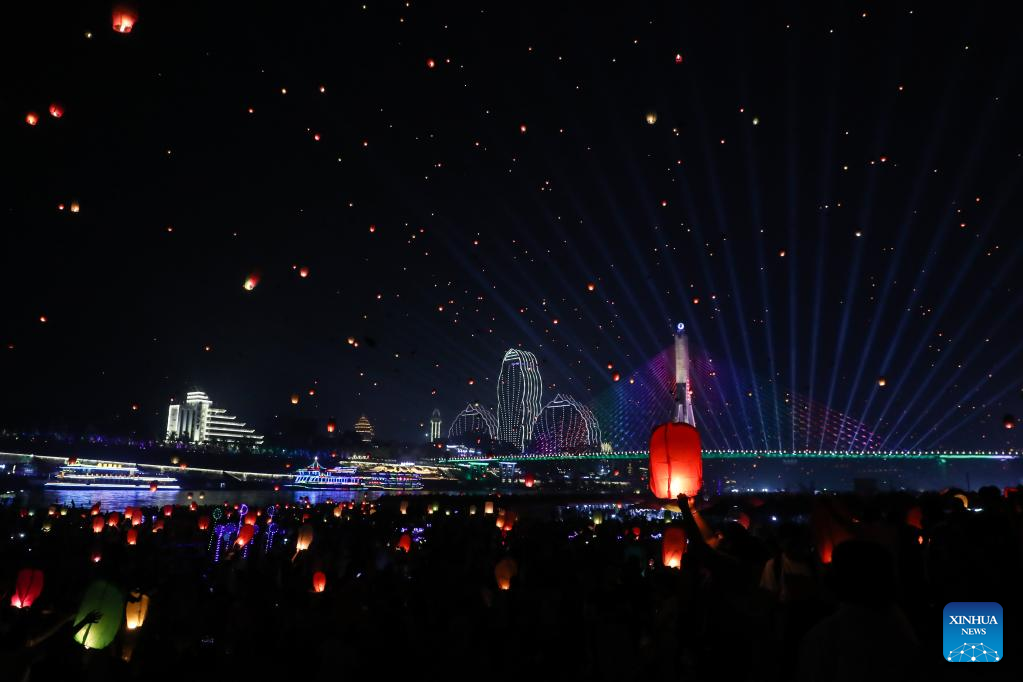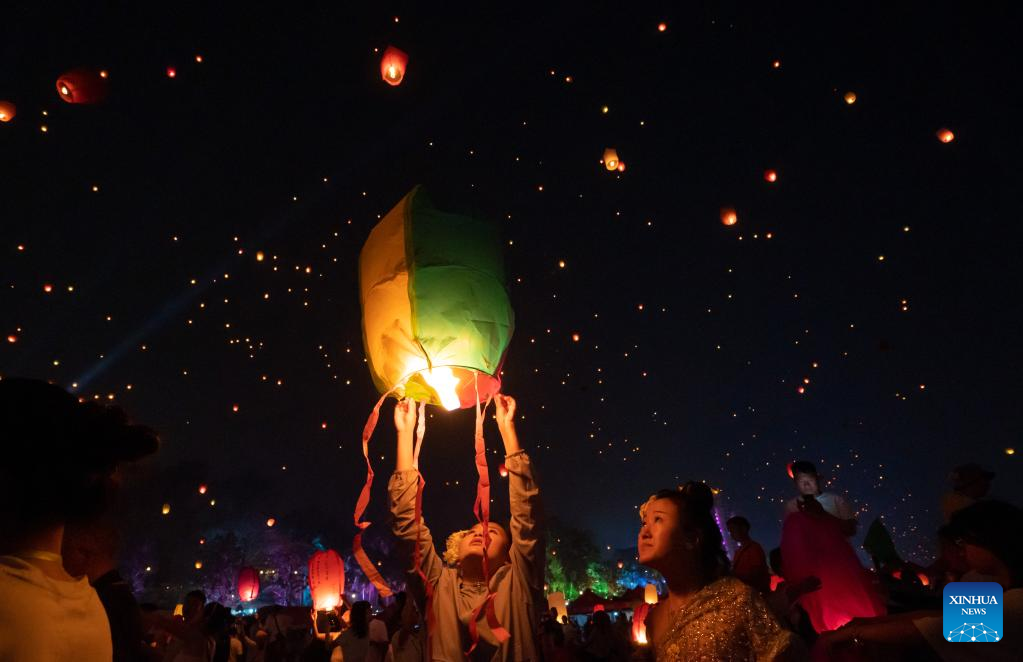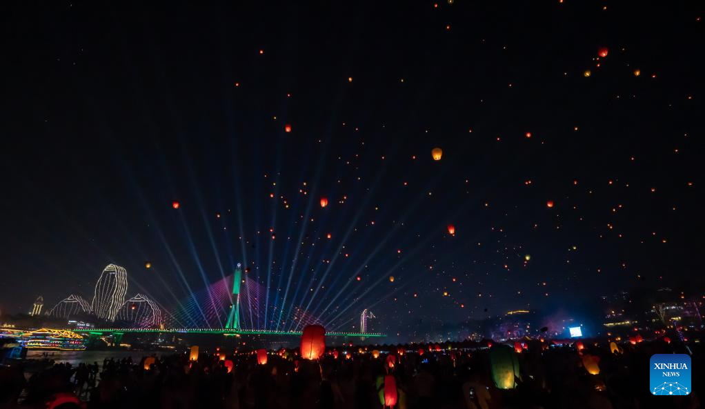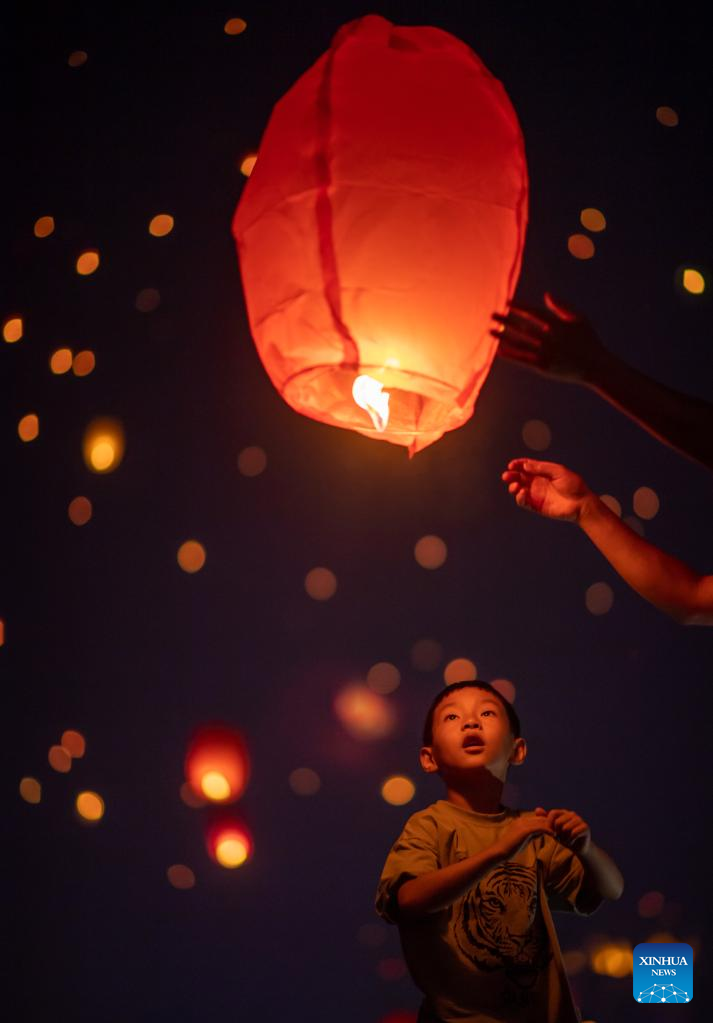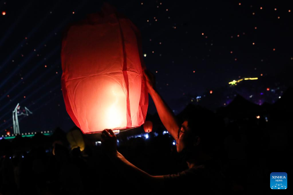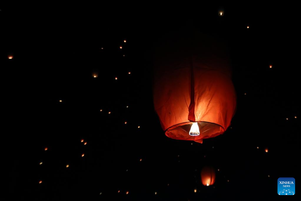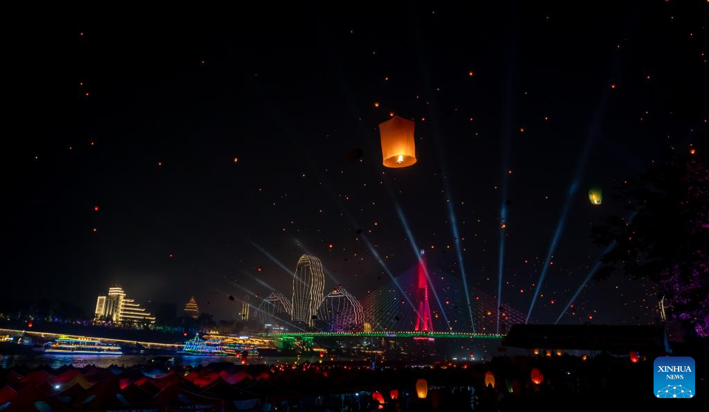 Sky lanterns are released during the annual Water Splashing Festival in Jinghong City of Xishuangbanna Dai Autonomous Prefecture, southwest China's Yunnan Province, April 13, 2023. (Xinhua/Shan Yuqi)