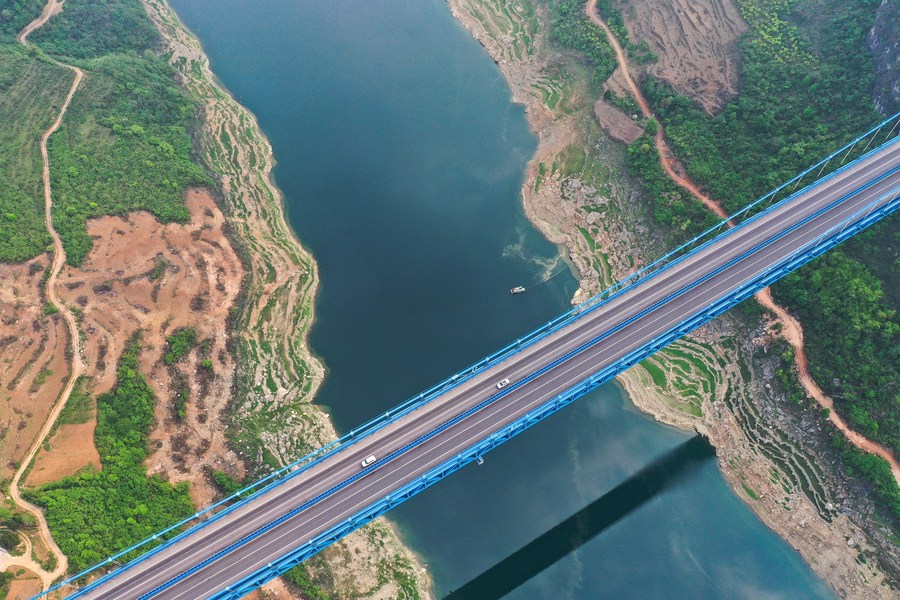 This aerial photo taken on April 13, 2023 shows the Kaizhou Lake bridge on the expressway linking Weng'an and Kaiyang in southwest China's Guizhou Province. (Xinhua/Yang Wenbin)