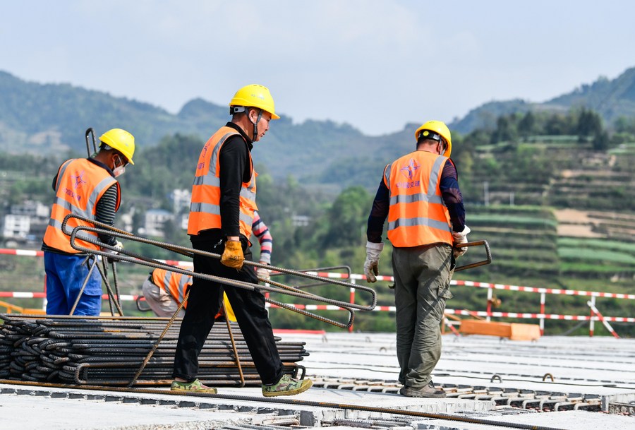 Workers work at the construction site of the Wujiang grand bridge on the expressway linking Dejiang and Yuqing in southwest China's Guizhou Province, April 11, 2023. (Xinhua/Yang Wenbin)