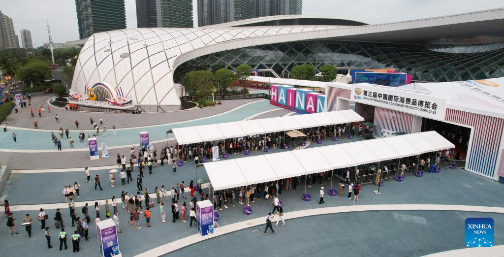 Visitors walk into the exhibition hall of the third China International Consumer Products Expo (CICPE) in Haikou, capital city of south China's Hainan Province, on April 14, 2023. The expo opened to the public on Friday. (Xinhua/Li Xin)