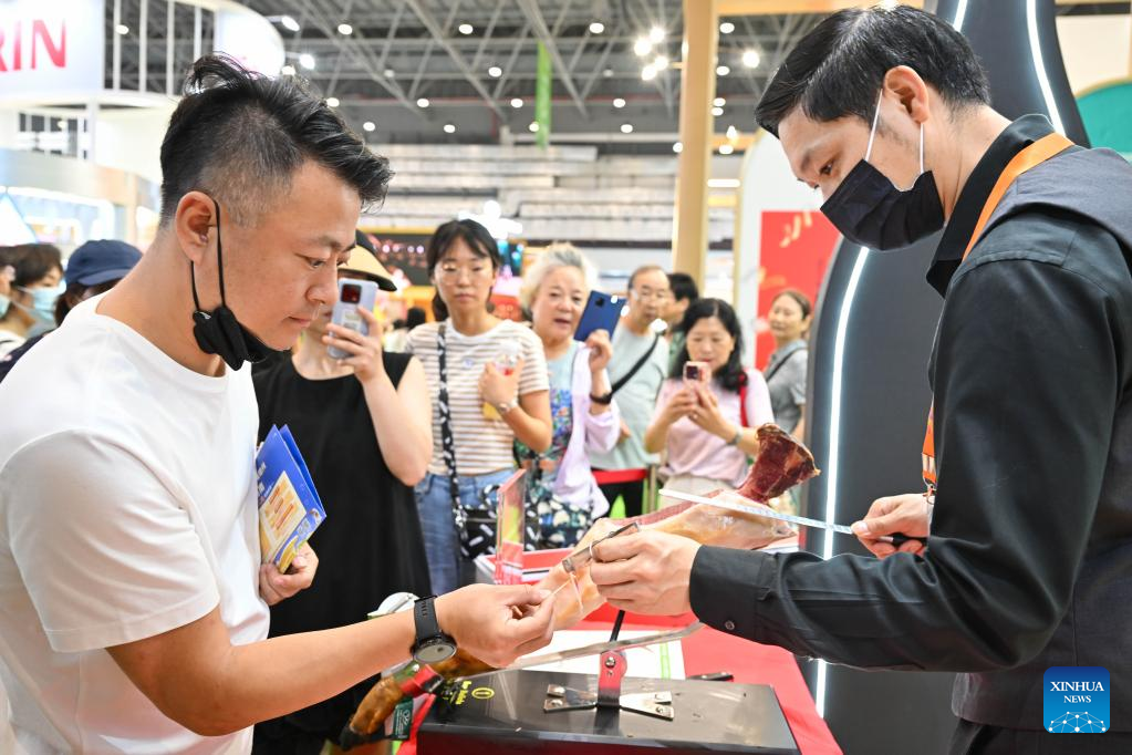 Visitors taste Spanish ham at the third China International Consumer Products Expo (CICPE) in Haikou, capital city of south China's Hainan Province, on April 14, 2023. The expo opened to the public on Friday. (Xinhua/Wang Zecong)
