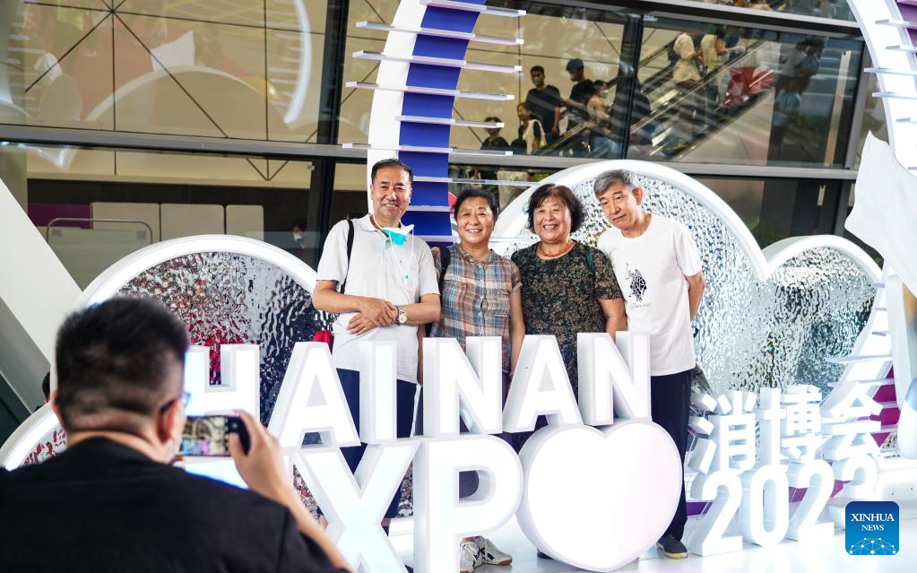 Visitors take a selfie at the third China International Consumer Products Expo (CICPE) in Haikou, capital city of south China's Hainan Province, on April 14, 2023. The expo opened to the public on Friday. (Xinhua/Li Xin)