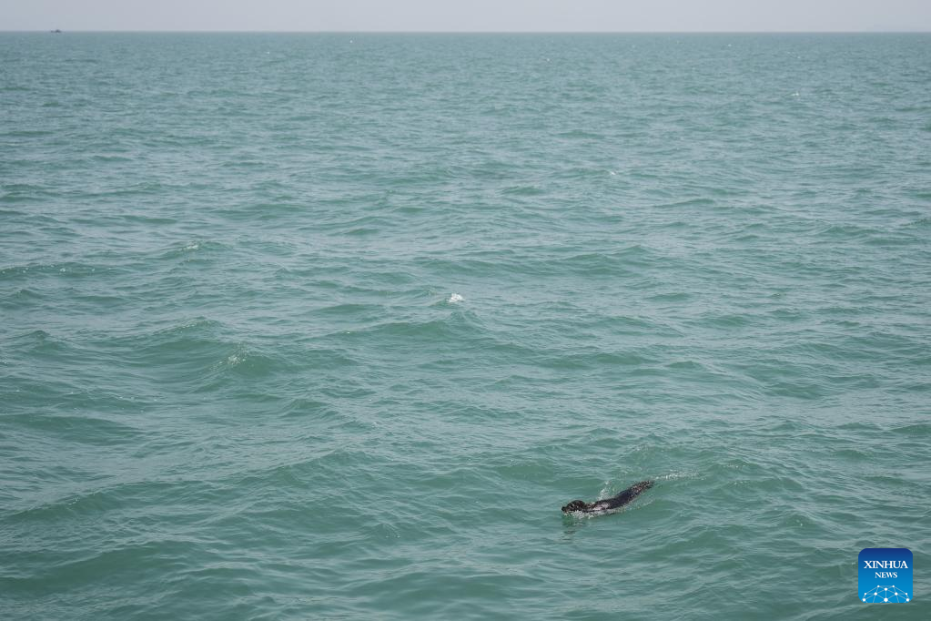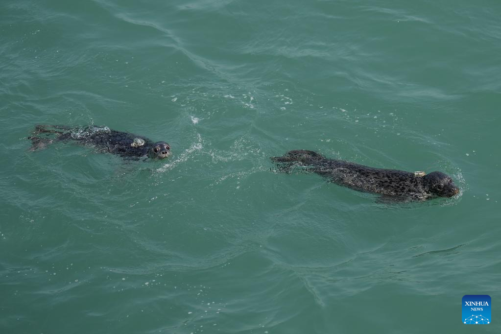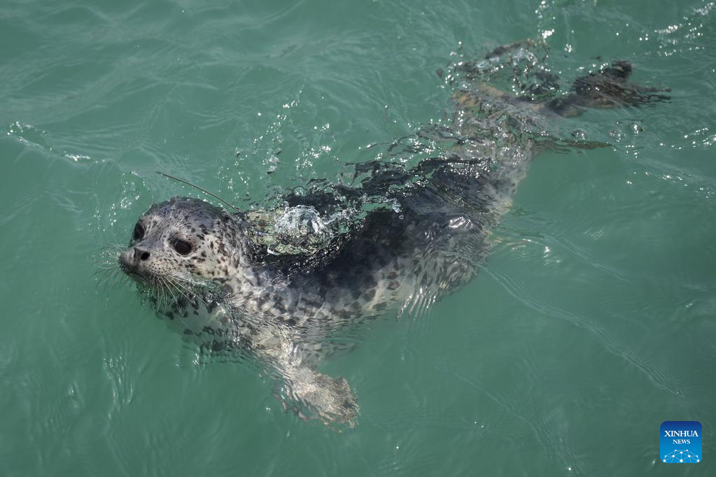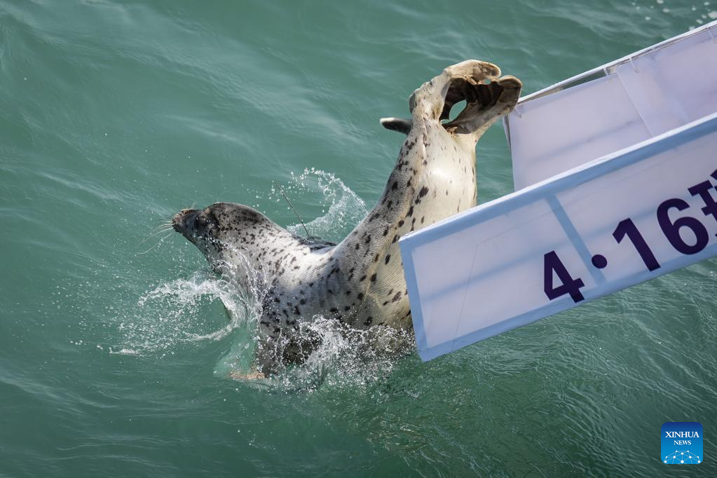 Spotted seals are released into the sea in Dalian, northeast China's Liaoning Province, April 16, 2023. A total of seven spotted seals were released into the sea on Sunday in the coastal city of Dalian. (Xinhua/Pan Yulong)