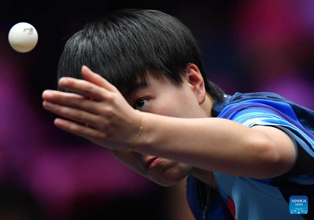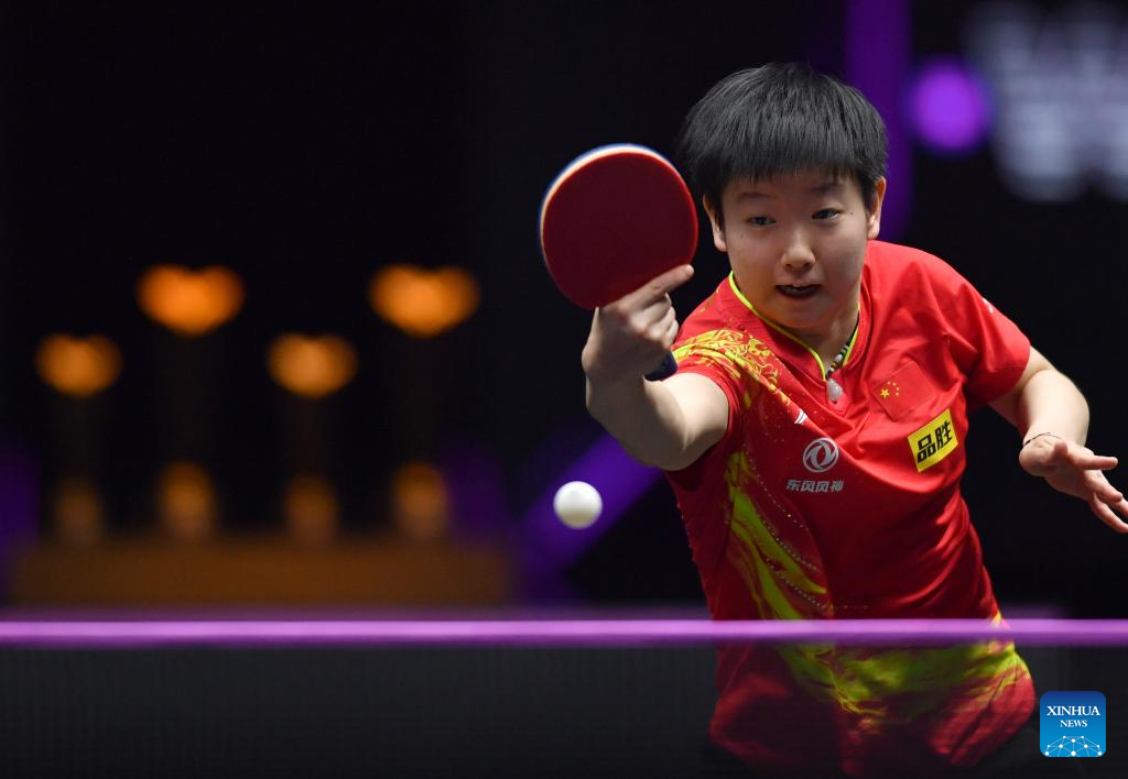 Sun Yingsha of China hits a return during the women's singles final against her compatriot Wang Yidi at the WTT Champions Xinxiang 2023 in Xinxiang, central China's Henan Province, April 15, 2023. (Xinhua/Li Jianan)