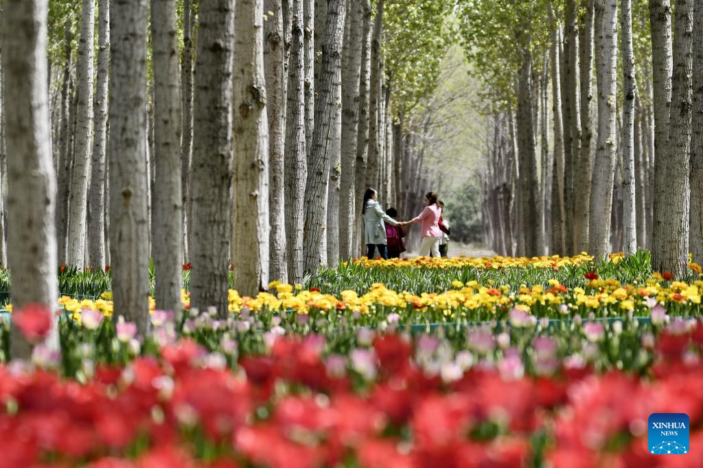 Tourists enjoy the scenery of blooming flowers by Yongding River in Daxing District of Beijing, capital of China, April 15, 2023. Colorful flowers of various species are in full bloom, attracting many tourists to spend their leisure time here. (Xinhua/Li Xin)