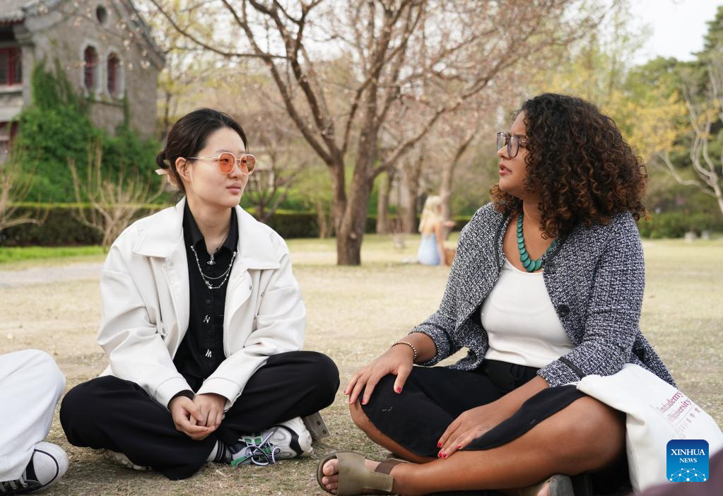 Maria (2nd R) talks with schoolmates at the Yenching Academy of Peking University in Beijing, capital of China, April 13, 2023. (Xinhua/Liu Lingyi)
