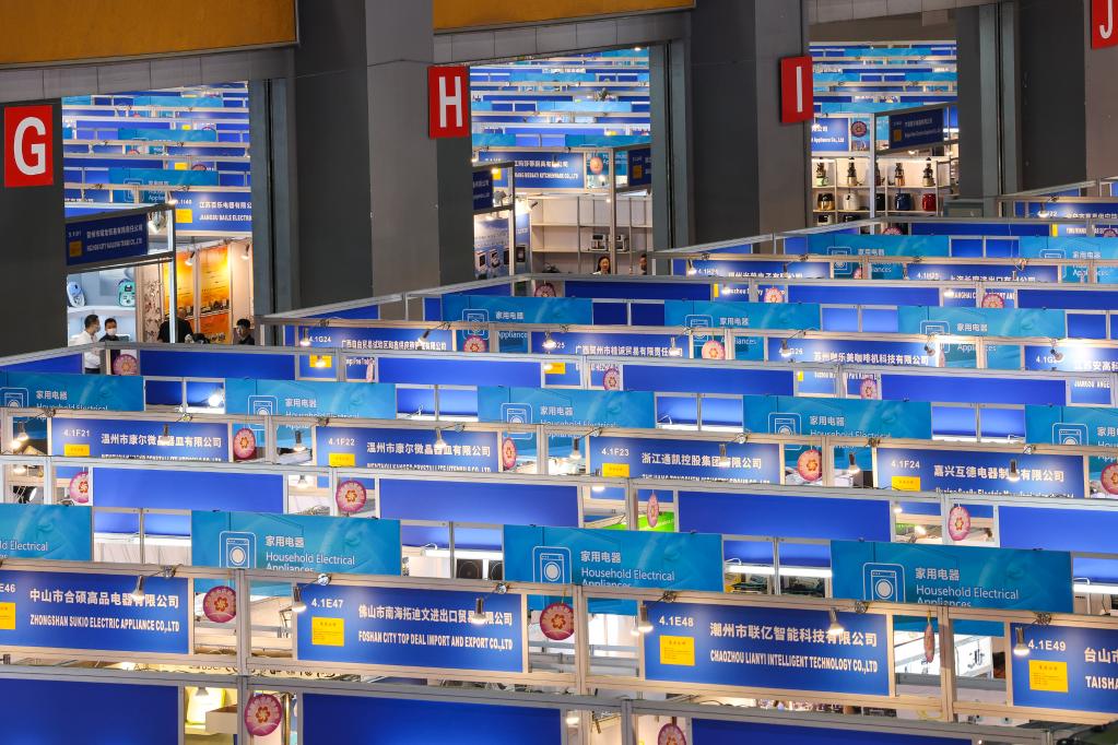 This photo taken on April 15, 2023 shows trade booths at the Electronics &Household Electrical Appliances exhibition section of the 133rd session of China Import and Export Fair, also known as Canton Fair, in Guangzhou, South China's Guangdong province. [Photo/Xinhua]