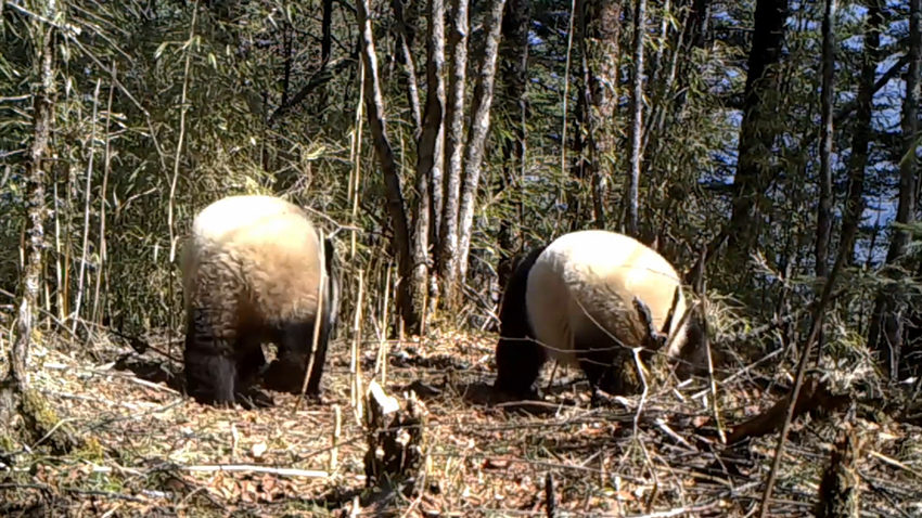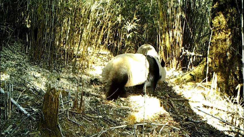 Two wild giant pandas of about the same size ambled together in China's Giant Panda National Park as if they were on a date. The scene was captured on tape by an infrared camera installed in Shimian county, Ya'an city, southwest China's Sichuan Province.