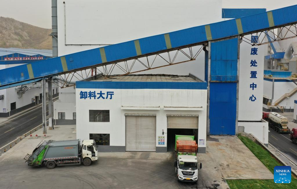 This aerial photo taken on April 13, 2023 shows a garbage truck unloading waste at the factory of Tangshan Jidong Qixin Cement Co., Ltd. in Tangshan, north China's Hebei Province. The history of Tangshan Jidong Qixin Cement Co., Ltd., formerly known as Tangshan Qixin Cement Plant, dates back to 1889. In recent years, the company has switched to a high-quality green development mode, achieving both economic and ecological benefits. (Xinhua/Mu Yu)