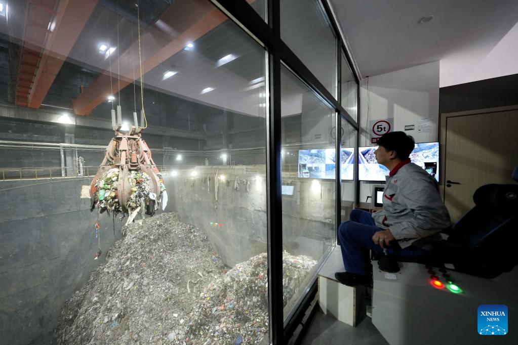 A staff member operates a machine to transport wastes at Tangshan Jidong Qixin Cement Co., Ltd. in Tangshan, north China's Hebei Province, April 13, 2023. The history of Tangshan Jidong Qixin Cement Co., Ltd., formerly known as Tangshan Qixin Cement Plant, dates back to 1889. In recent years, the company has switched to a high-quality green development mode, achieving both economic and ecological benefits. (Xinhua/Mu Yu)
